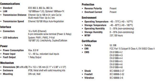 EKI-7526I 是一款经济高效的工业级以太网交换机,支持16 个10/100Base-TX 快速以太网口,传统的光纤端口可用于远程传输,灵活满足多种领域的需要。高MTBF 降低了运行与维护成本。所有的以太网口都具有缓存,支持“存储转发”机制,能够确保数据的完整传输。此外,EKI-7526I还支持多种先进的网络标准,优化网络的性能,易于维修,保护网络的安全。