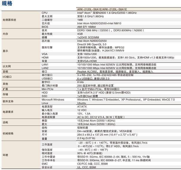 采用Intel® Atom™ N2600/D2550 1.86GHz处理器的无风扇紧凑型嵌入式工控机